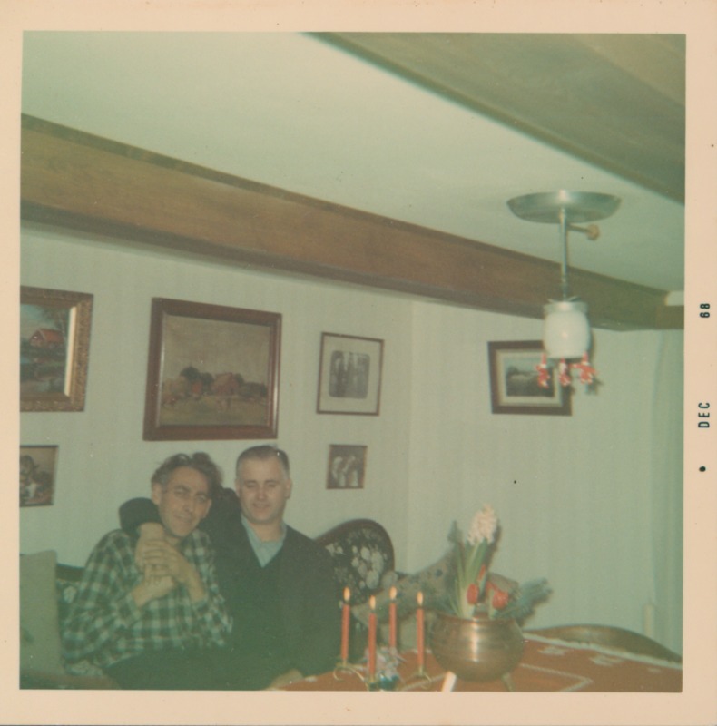 Vardagsrummet i Gretas torp. Nils sitter på soffan och brevid honom sitter en man och håller om honom. På bordet står en julljusstake.