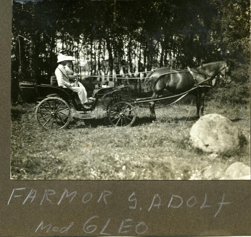 Maria Paulsson med sonen Gustaf Adolf Paulsson sitter i en häsdragen vagn bakom hästen Gleo.