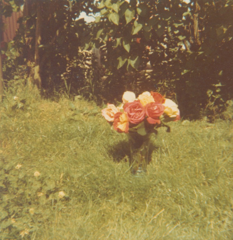 Rosor i vas på en gräsmatta