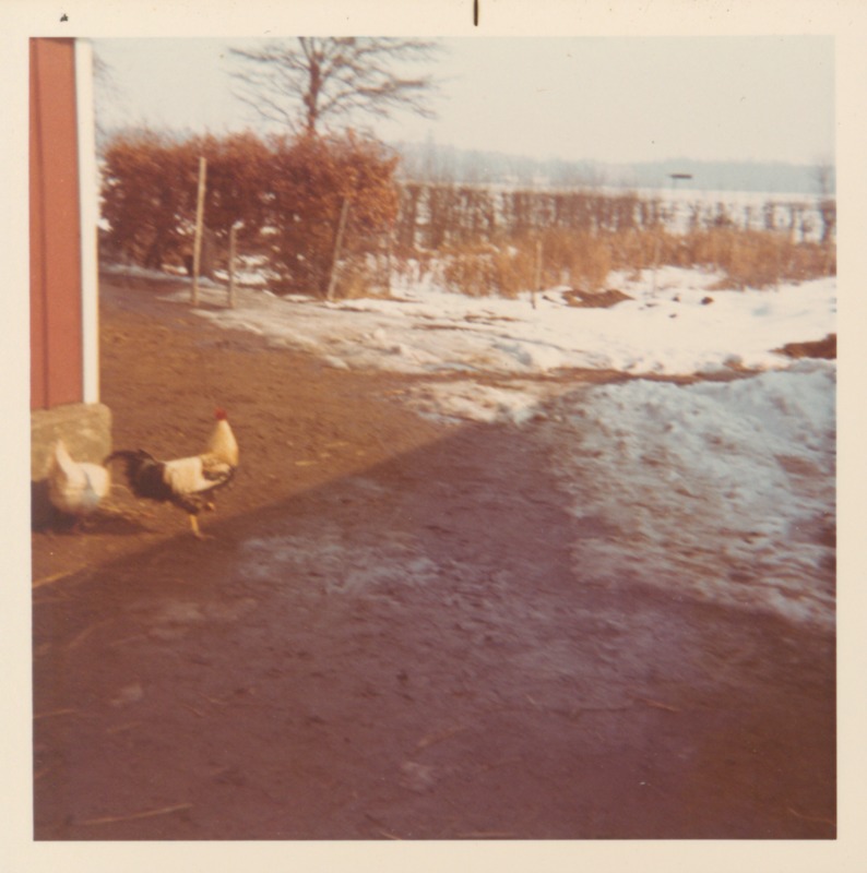 Höns på gårdsplanen, vinterbild.