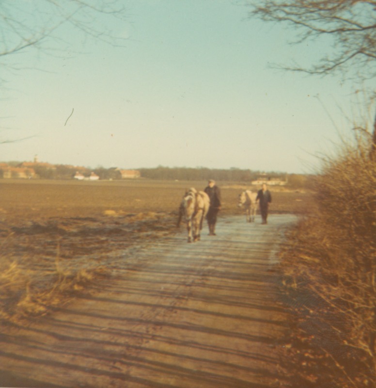 Nils och en annan man kommer gående längs vägen med varsin häst.