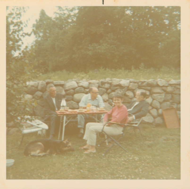 Trädgårdsbild från Pålsjö. Fyra personer sitter runt ett utebord och fikar. Nils sitter längst till vänster. På marken ligger en hund.