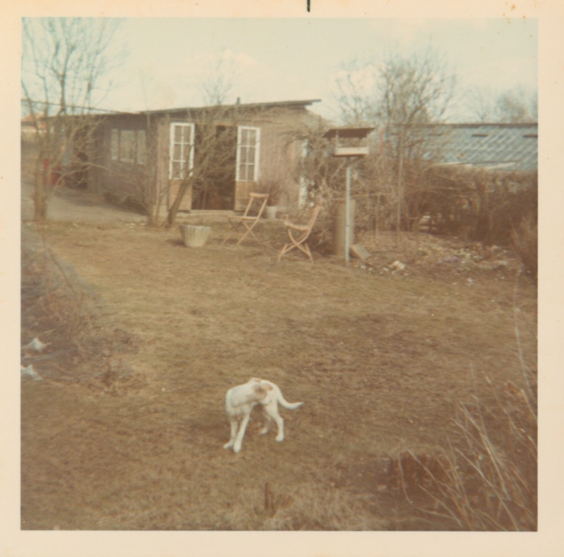 Hund på gårdsplan framför skjul och växthus