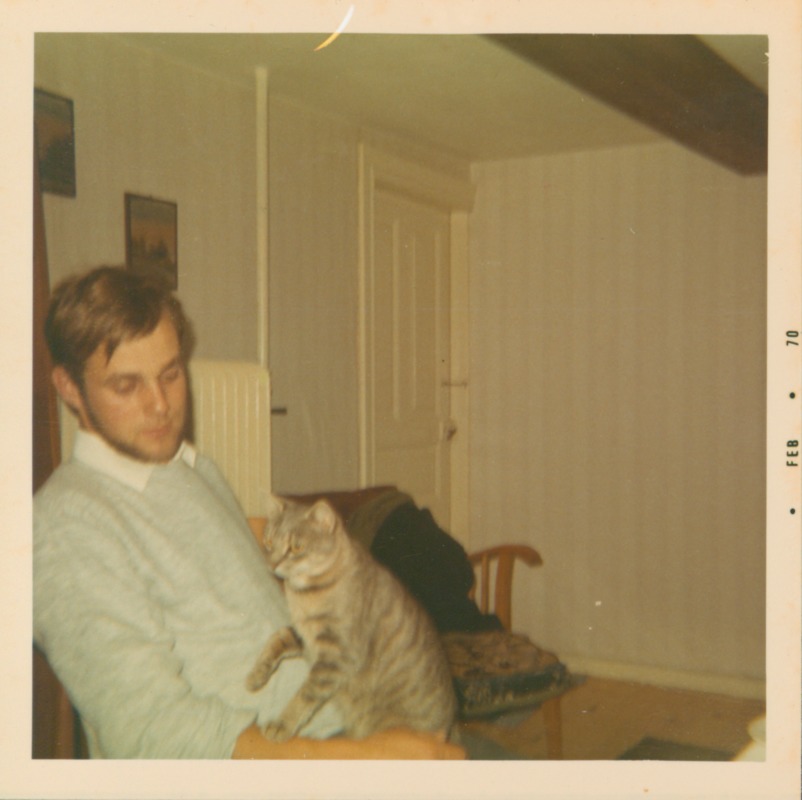 En yngre man med skägg sitter i vardagsrummet i Gretas torp och har en grå katt i knät.
