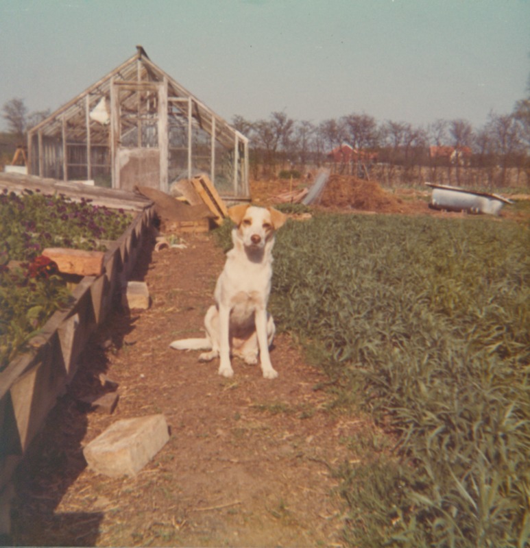 Bland växthus och odlingar sitter en hund.