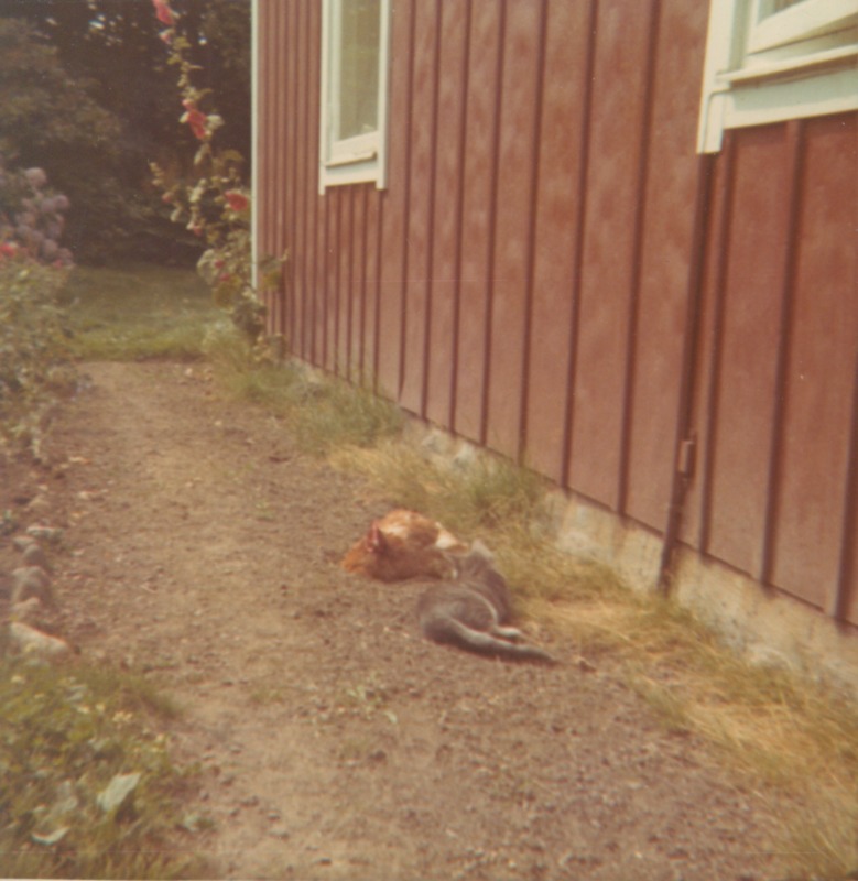 Två katter ligger på gruset framför boningshuset på Landegrensgatan 18