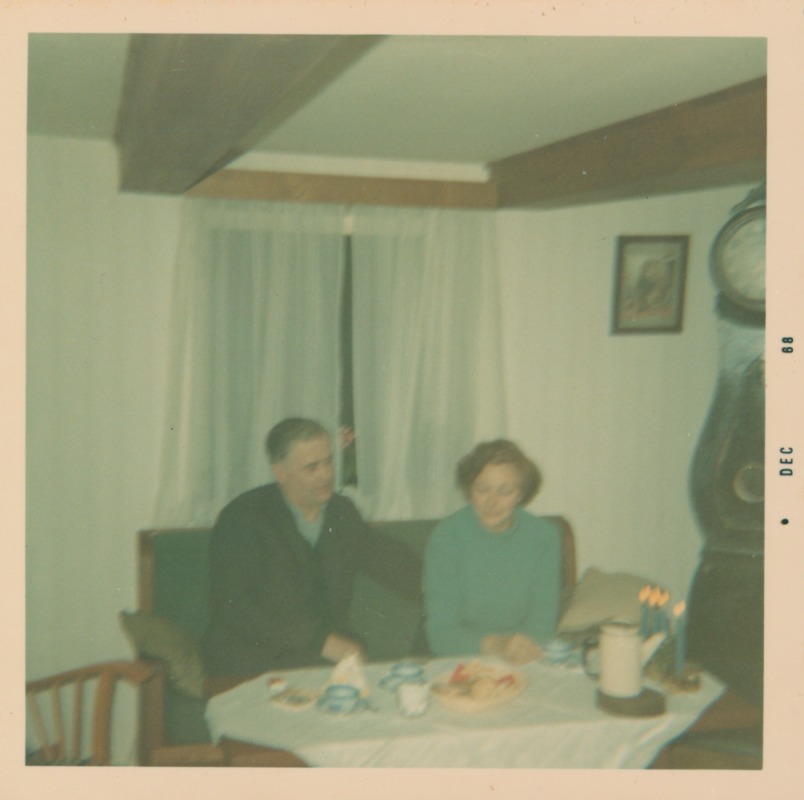 Interiörbild, två personer sitter i en soffa framför ett dukat kaffebord.