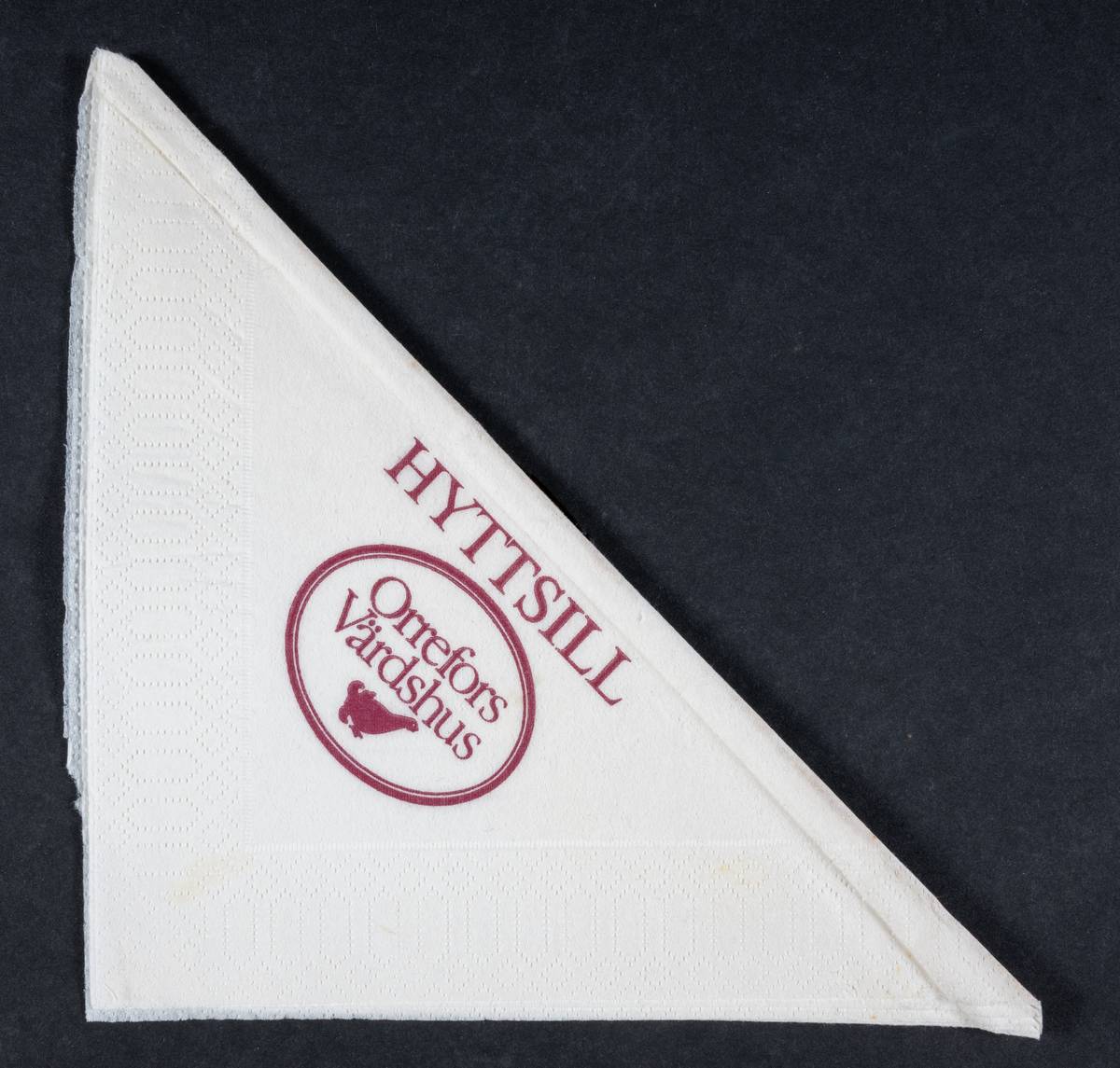 En vit pappersservett med rött tryck "Hyttsill", från Orrefors värdshus. Trol. från hyttsillen i Orrefors 1994, för att fira
