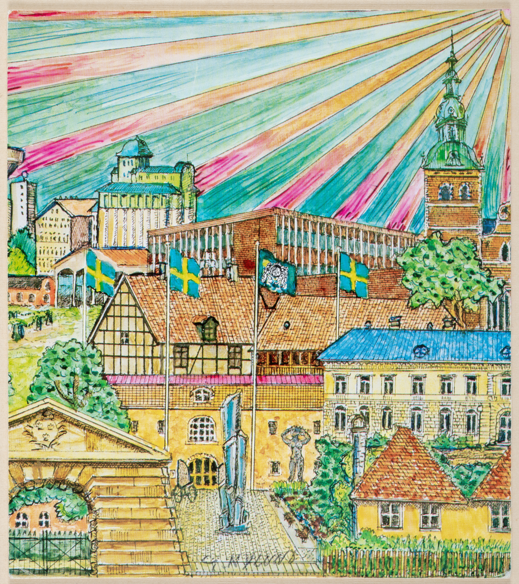 Stadsvy, Kristianstad med flera byggnader, t ex kyrkan, museet, residenset och kvarnen.