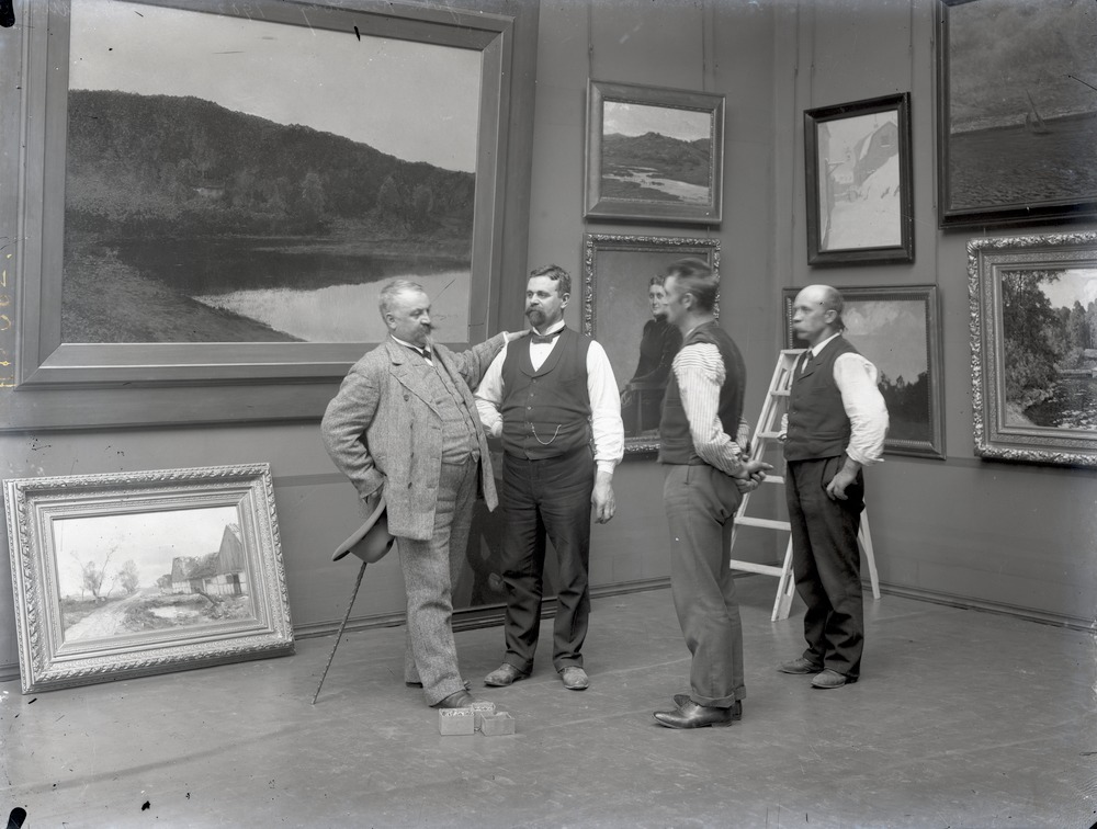 Landskapsmålaren Johan Kindborg och hand medhjälpare vid upphängningen i Konsthallen.