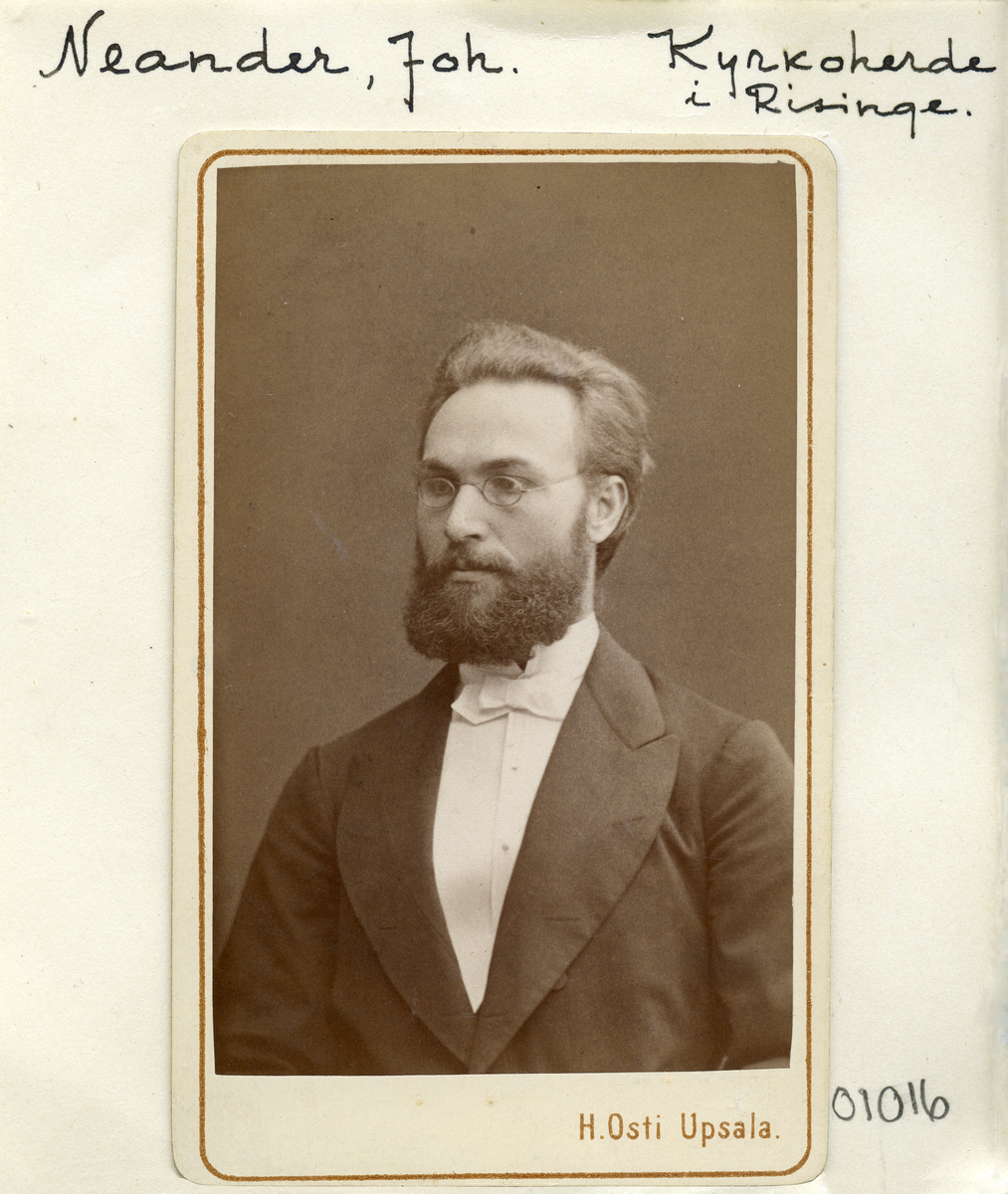 Johannes Neander (Andersson) föddes och växte upp under till synes enkla förhållanden i Vånga där föräldrarna var torpare. Under dessa omständigheter kom han ändå i studier vid Uppsala, där han avlade teologisk examen 1876. Under sin studietid tjänstgjorde han som predikant vid Uppsala sjukhus och därpå som föreståndare vid Johannelunds missionsinstitut i Stockholm. Under större delen av 1880-talet var han redaktör för Evangeliska fosterlandsstiftelsens missionstidningen. Från 1886 kyrkoherde i Risinge. Han hade då varit gift med Johanna Maria Edman sedan tio år. Här porträtterad i Uppsala omkring 1875.