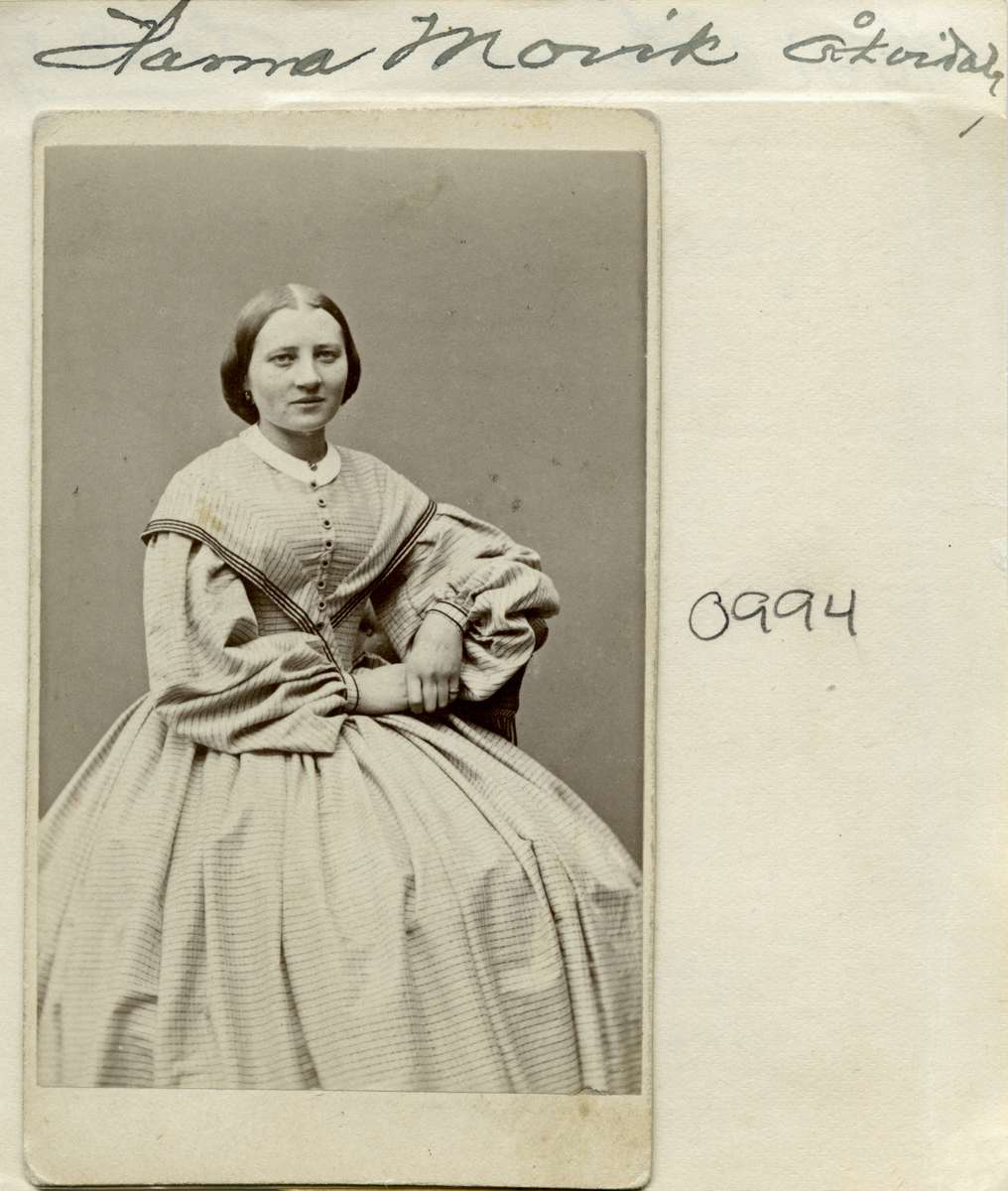 Porträtt av fröken Hanna Movik. Född i Västervik 1837 kom hon från 1859 som mamsell att ingå i Carl Johan Ajaxsons hushåll i dennes säteri i Vårdsberg. Från 1863 bodde hon hos sin bror, brukskassören Werner Movik i Åtvidaberg. Här blev hon kvar till det nya seklets inträde. År 1901, några år efter broderns död, flyttade hon till brorsdotterns hushåll i Vetlanda. När den yngre släktingens make erbjöds tjänsten som provilialläkare i Ekeby, flyttade Hanna med. Hennes liv ändades där av hjärtfel i kombination med lunginflammation den 25 januari 1910. Foto omkring 1870.