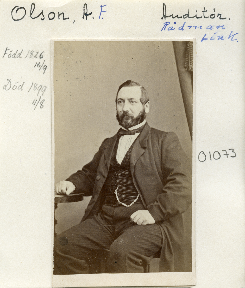 Porträtt av Adolf Fredrik Olsson. Från 1859 auditör vid Andra livgrenadjärregementet i Linköping. Även rådman i Linköping 1876 och förste sådan från 1890, jämte mångårig ordförande i Linköpings stadsfullmäktige med flera befattningar. Gift i Stockholm 1881 med Emma Augusta Bengtsson. Foto 1860-tal.
