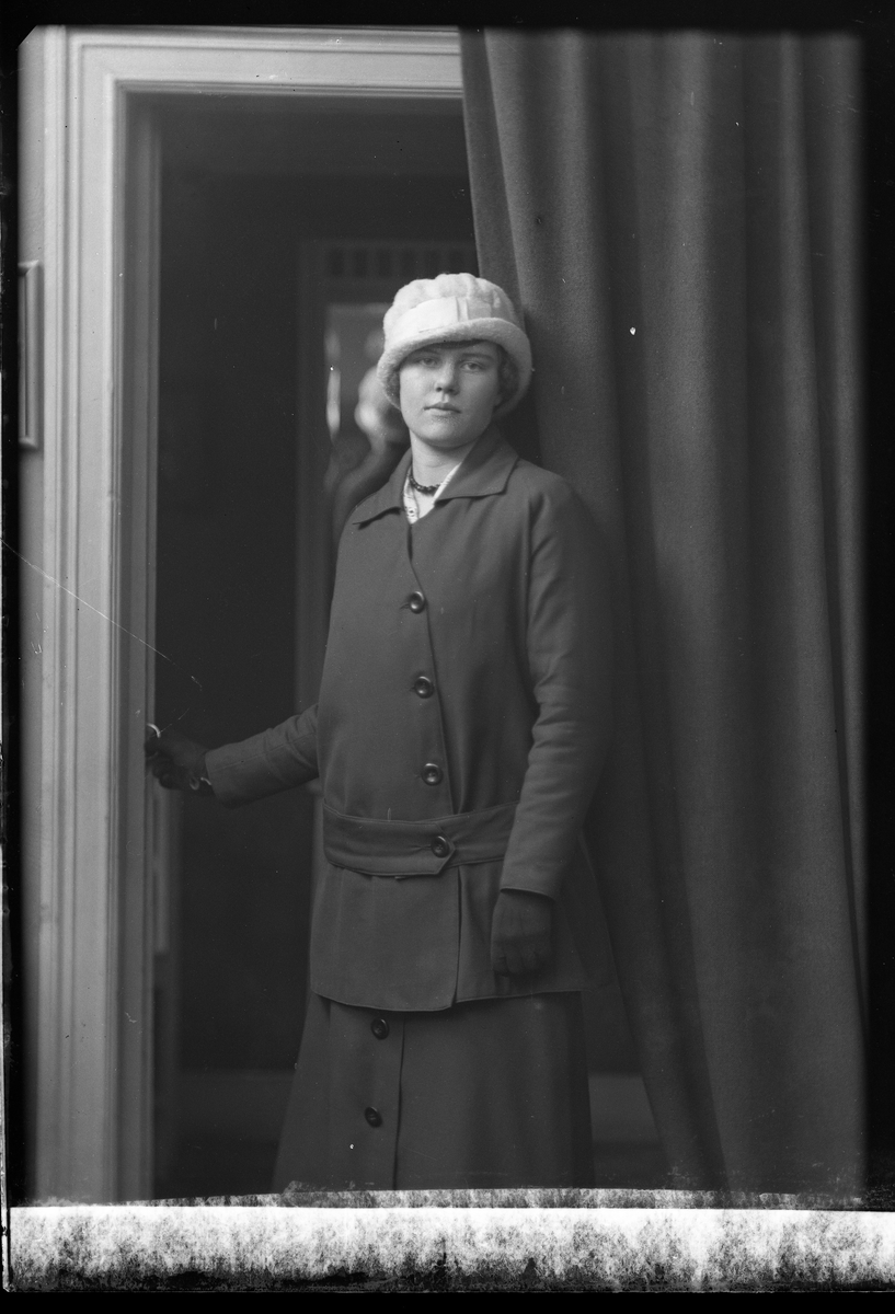 Porträtt av Rosa Strand stående i en draperad dörröppning klädd i vit hatt, mörk dräkt och mörka handskar.