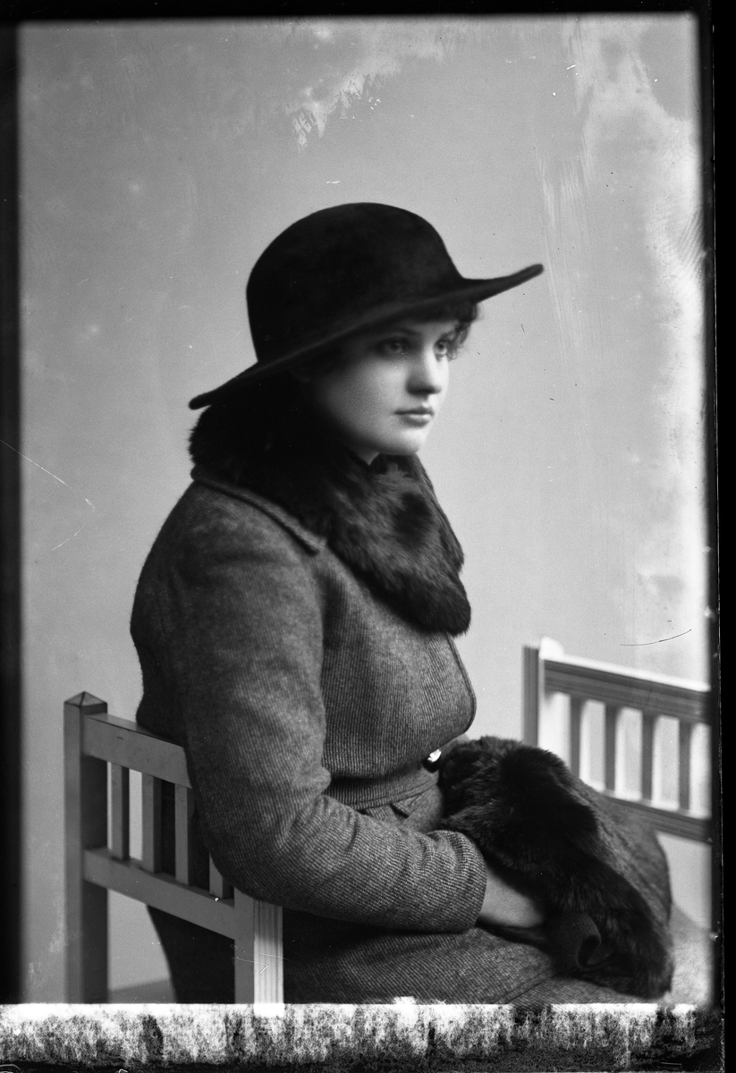 Porträtt av Vivan Hedlund sittandes på en pall och klädd i svart bredbrättad hatt, ytterkappa samt krage och muff i mörk päls.
