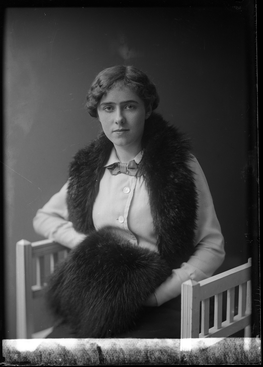 Porträtt av fr. Mellgren med pälsboa och muff, sittandes på en pall.