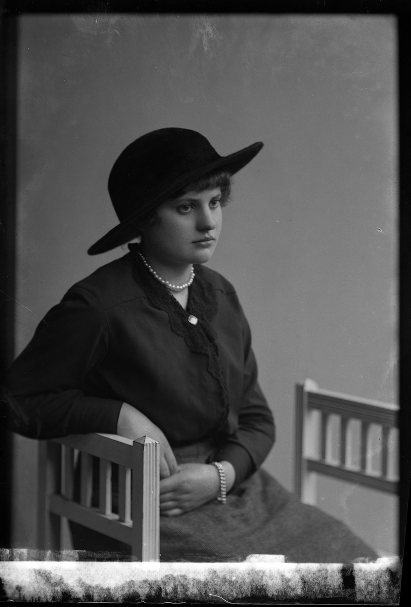Porträtt av Vivan Hedlund sittandes på en pall och klädd i svart bredbrättad hatt samt mörk blus och kjol. Runt handled och hals bär hon pärlor.