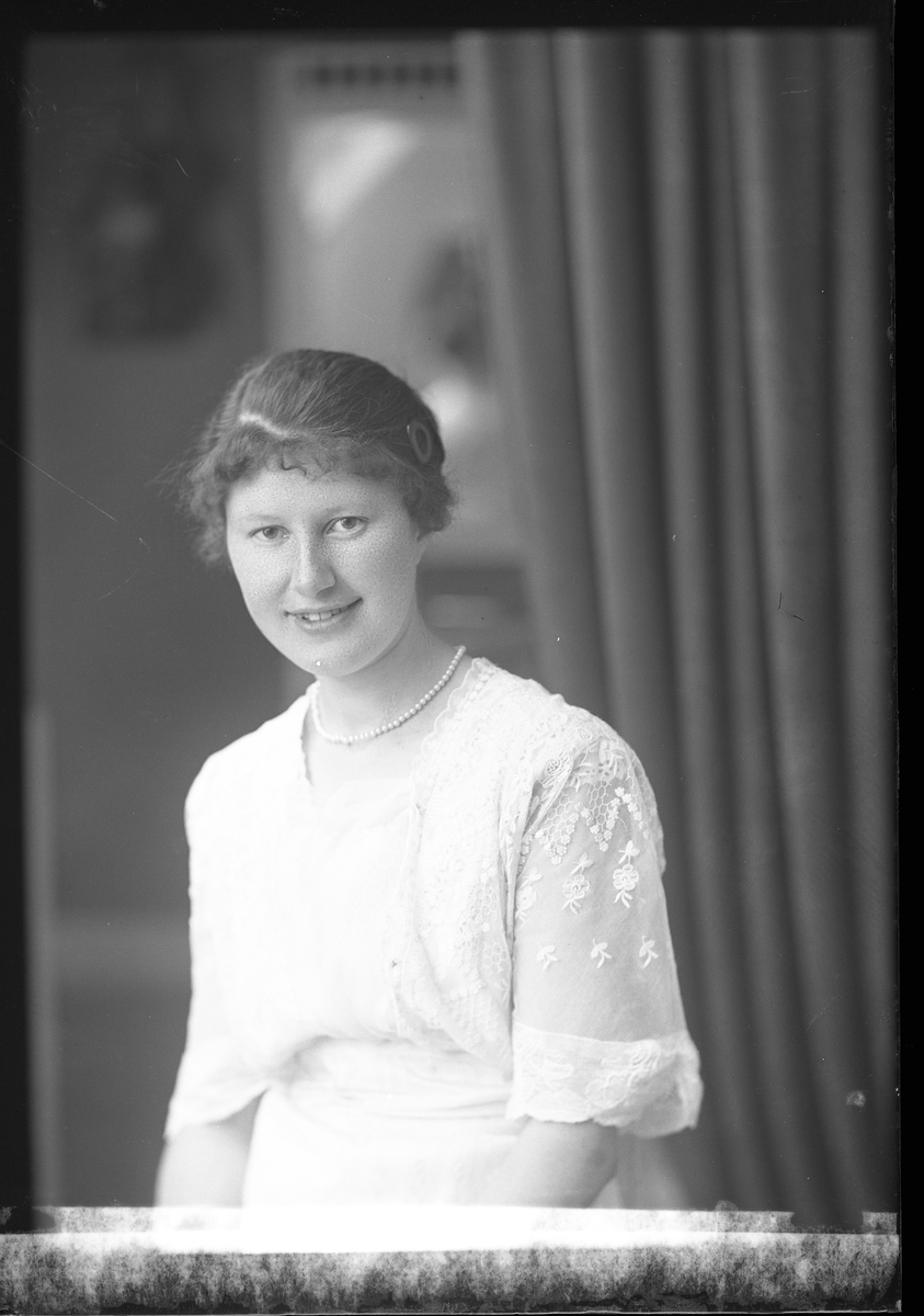 Porträtt av Elsa Sjöman i vit klänning med korta skira ärmar dekorerade med vitbroderi.