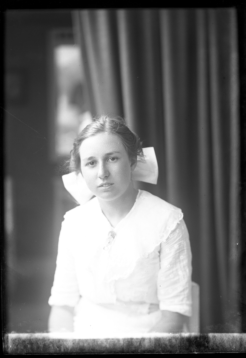 Porträtt av Lisa Tolstadius i vit klänning och vit rosett i håret.