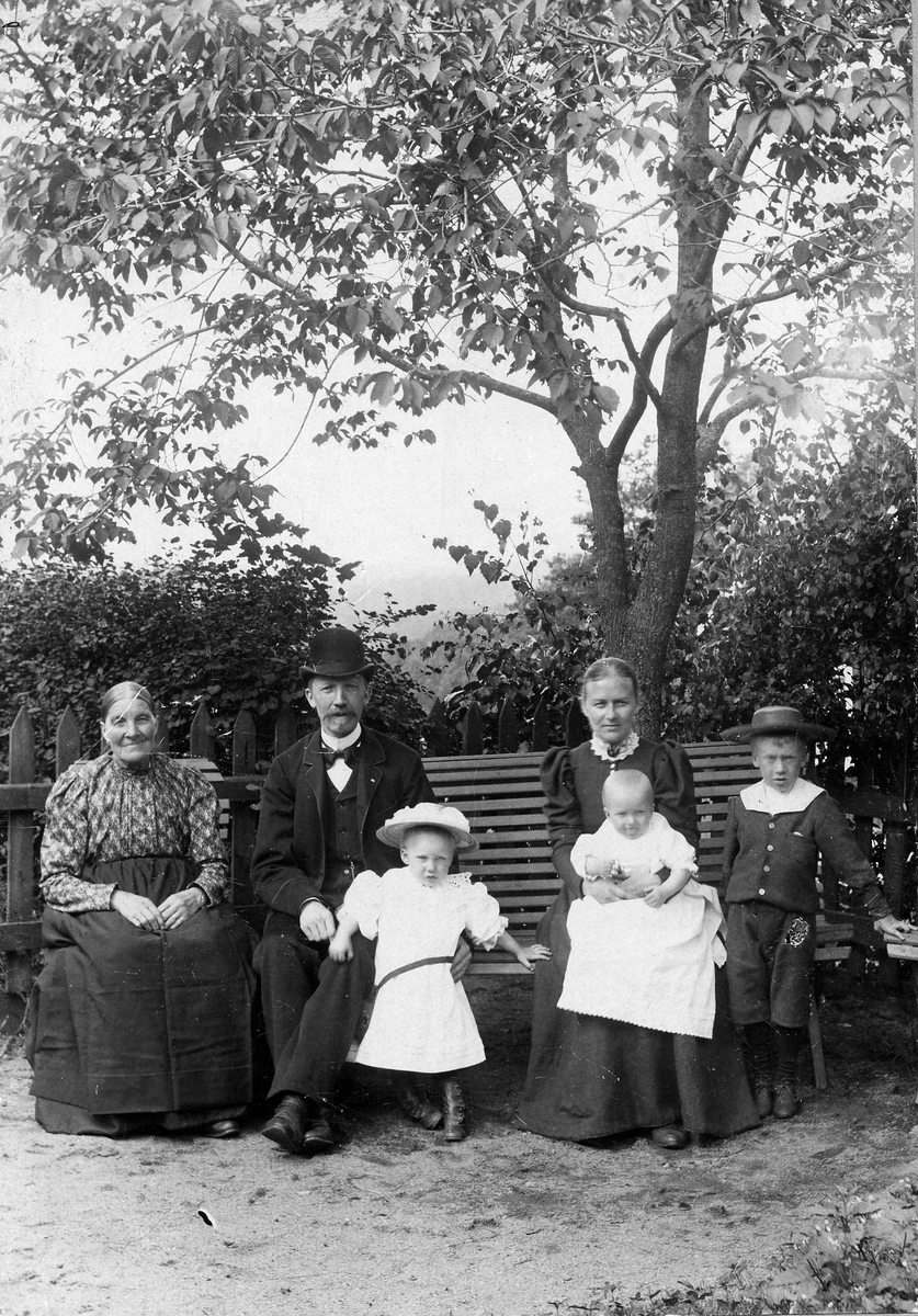 En man och två kvinnor sitter på en parkbänk tillsammans med tre små barn.
