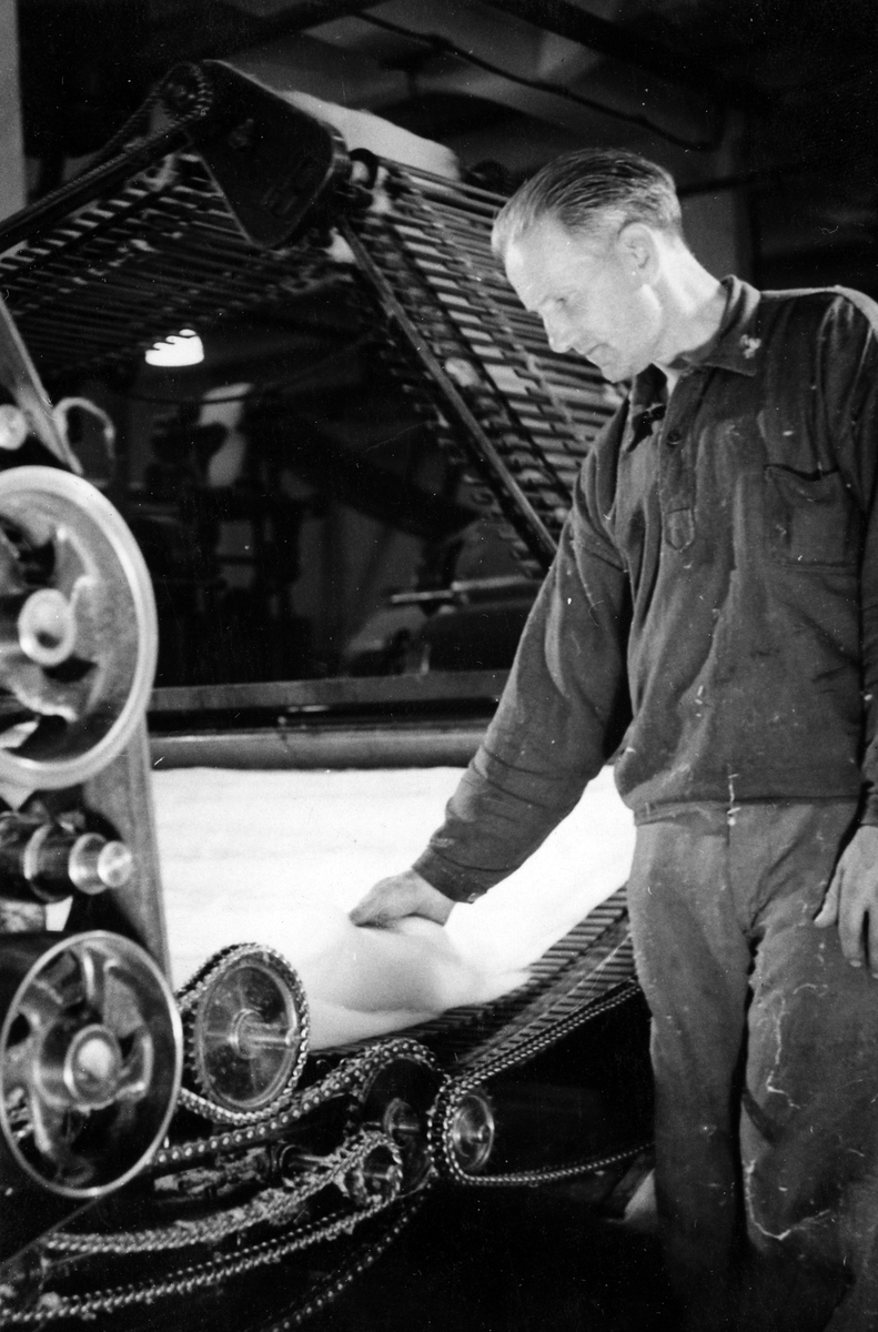 En man arbetar med kardmaskin, Nääs fabrik.