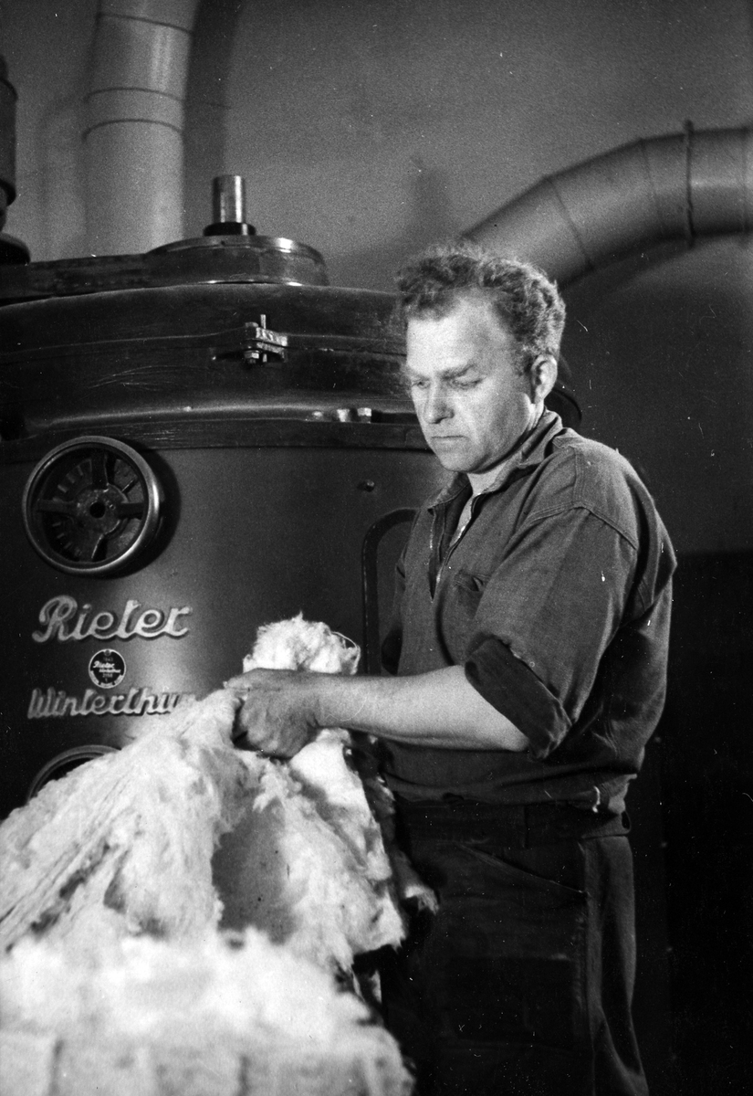 En man arbetar med att bryta balar. Nääs fabrik i Tollered.