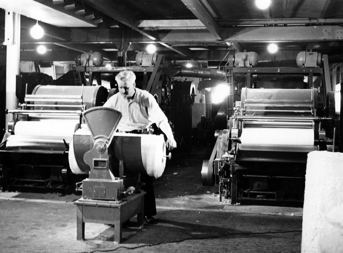En man väger bomull efter den rensats. Nääs fabrik i Tollered.