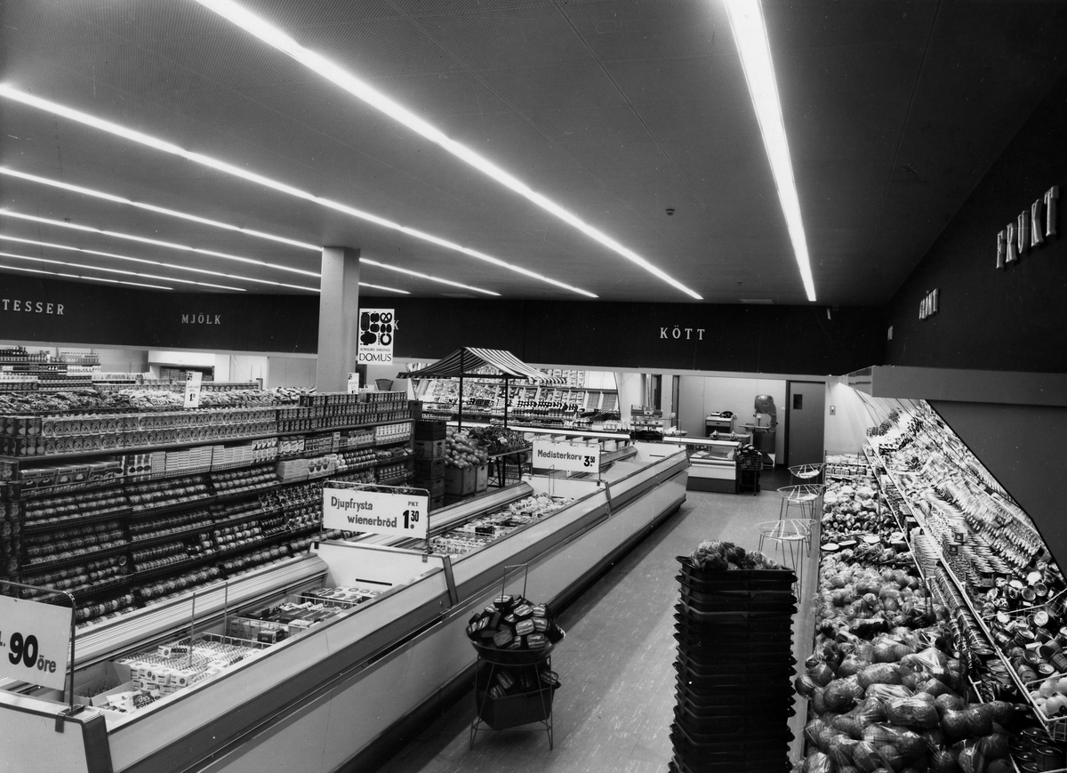 Domus i, kvarter Storken. Hörnet Kungsgatan-Färgaregatan. Interiör av livsmedelsaffären.