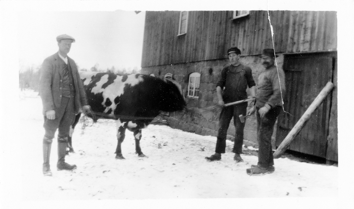 Tre män fotograferade med en tjur på väg till slakt. Bilden är troligen tagen i Maryd. Till vänster i bild står Ludvig Andersson, Ekåsaryd.