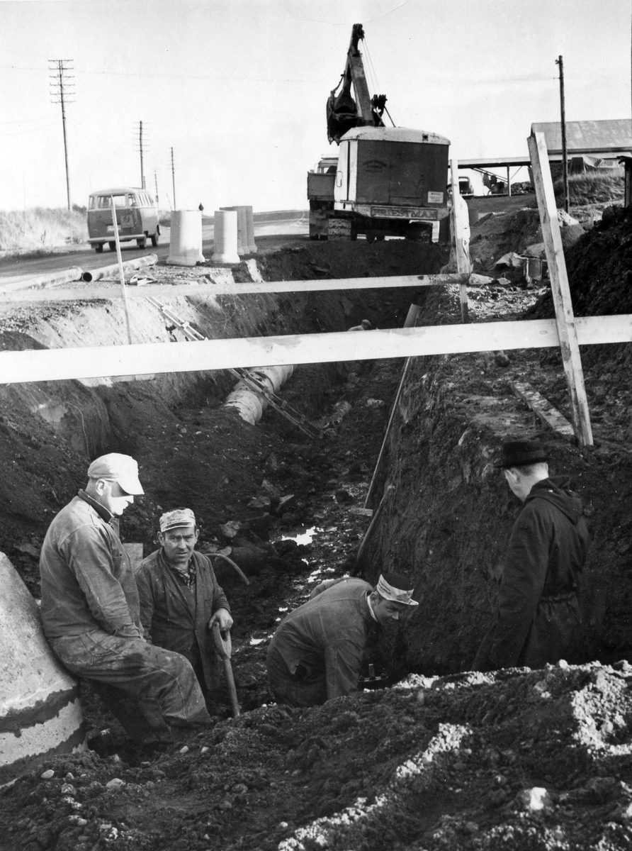 Tre män arbetar med att gräva ut en kloakledning i Noltorp.