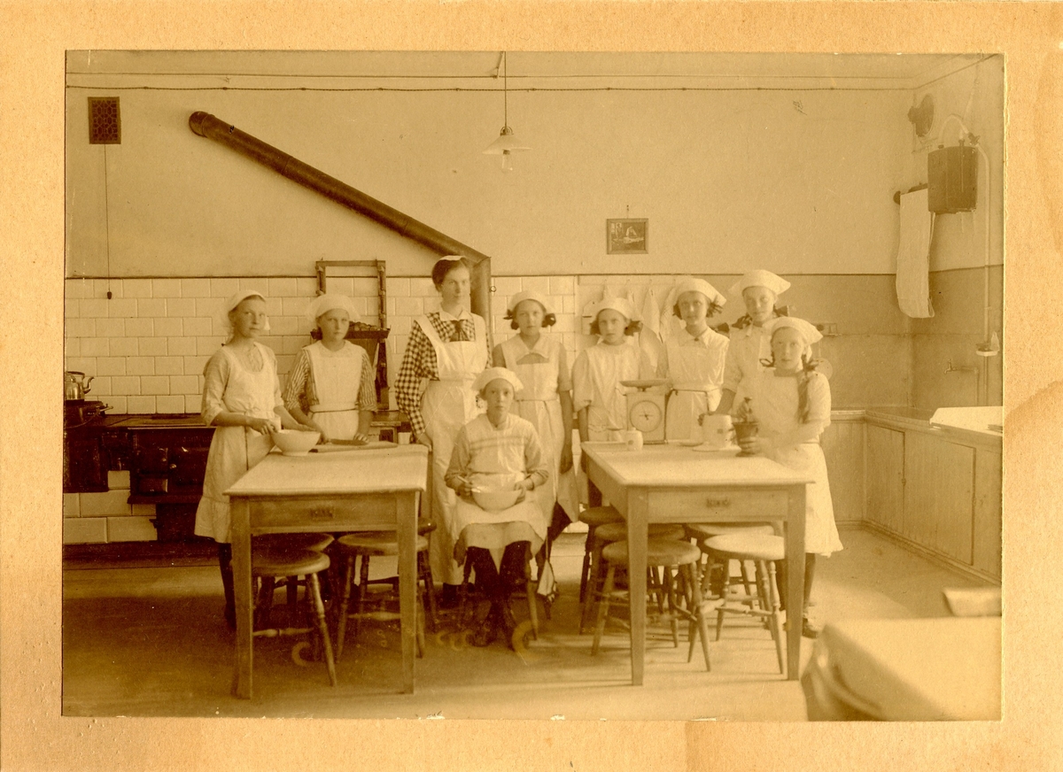 En grupp flickor undervisas i skolköket på Centralskolan. I mitten står lärarinnan Elsa Broman.