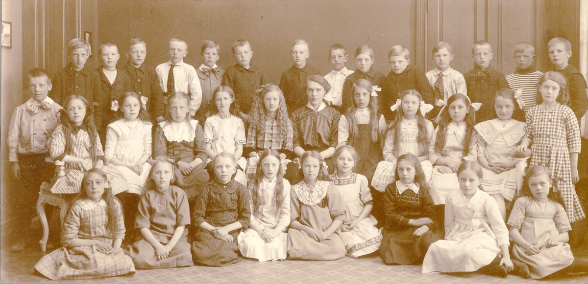 Alfhild Karlsson (gift Friskopp) med elever, ca 1912.