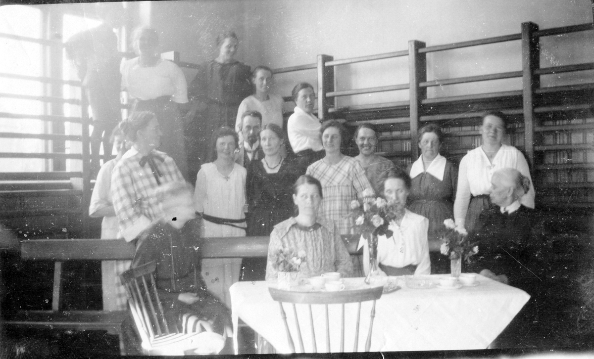 Stående från vänster: Anna Tengstrand, Helfrid Hasselskog (gift Dahlström), Josef Båth, Valborg Thedéen-Båth, Edit Larsson, troligen Alfhild Carlsson (gift Friskopp), troligen Anna Sahlstrand, Ester Sabdin.