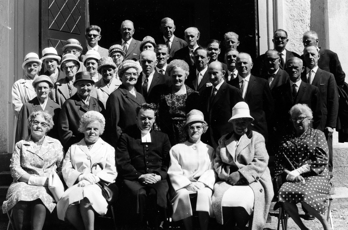 Gruppbild från en återförening av 1914-års konfirmander. Äldre kvinnor och män är samlade framför Hemsjö kyrkas ingång. I mitten längst fram en präst.