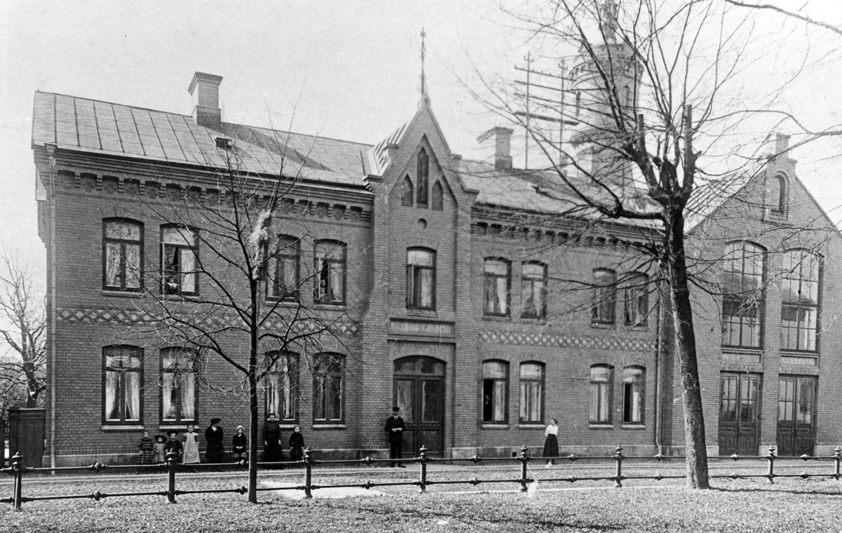 Brandstationen i kvarter Kristina. Fotot taget innan 1920 då portarna breddades. En man, tre kvinnor och sex barn står utanför byggnaden.