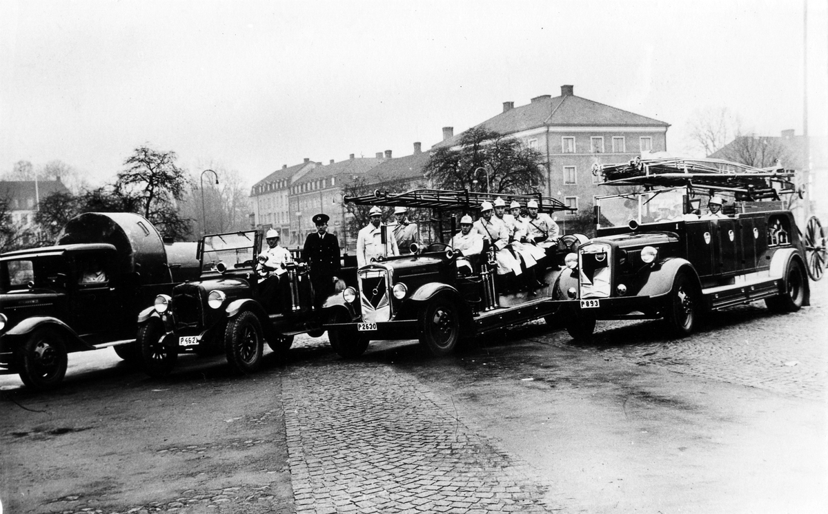Brandkåren på Stora torget med fyra brandbilar: Från vänster: P4621 Chevrolet 1927, P2630 Volvo 1936 (kallad "2:an"), P893 1940 (1939), P893 1921 "Tidaholm", samma nr hade den första brandbilen som levererades omkring 15/4 1921..