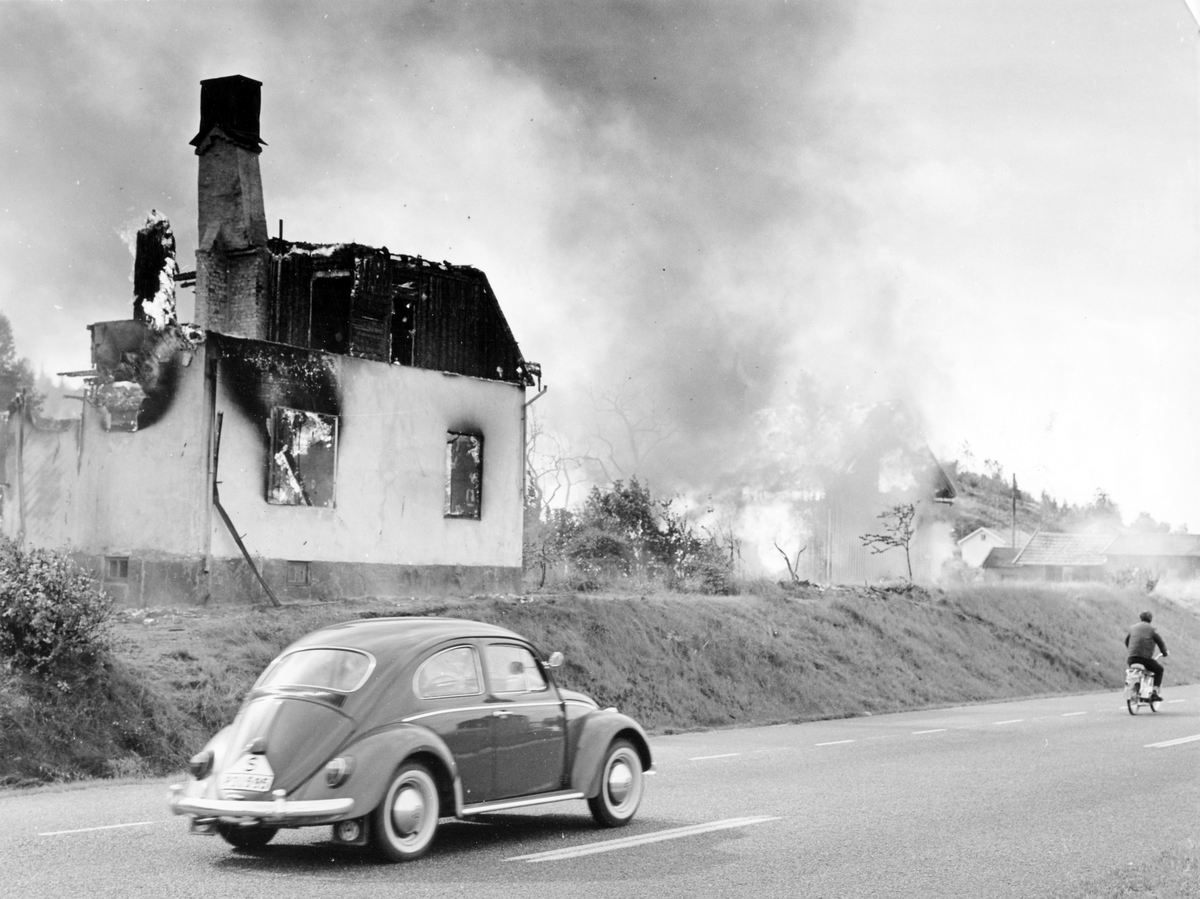 Brandkåren har övning och bränner ner gammal bebyggelse på Stockholmsvägen. På detta område ska sedan småindustrier uppföra verkstadsbyggnader.