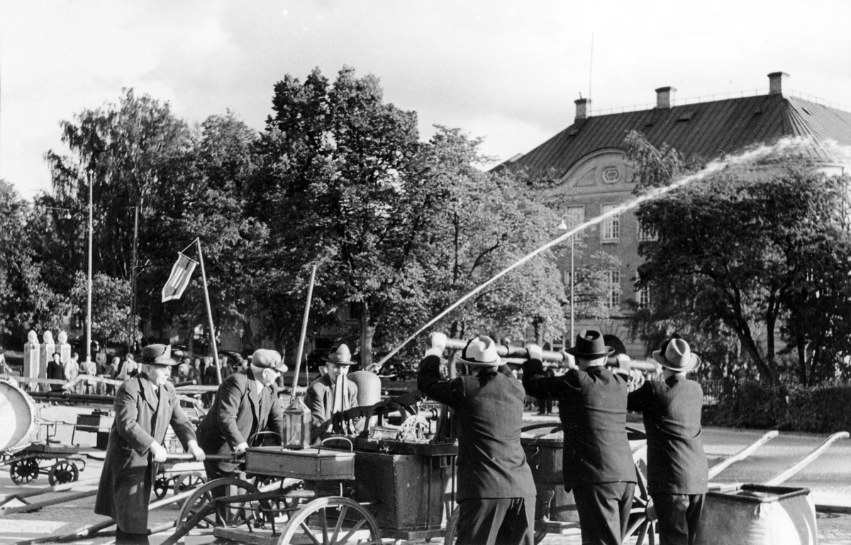 Brankårens 50-årsjubileum 1950. Gamla brandredskap demonstreras på Stora torget.