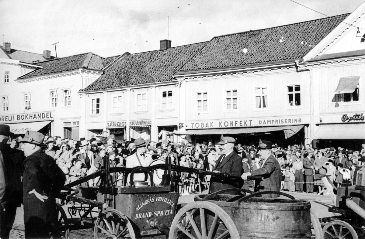 Brandkårens 50-års jubileum 1950. Gamla brandredskap demonstreras på Stora torget av några män inför en folksamling.