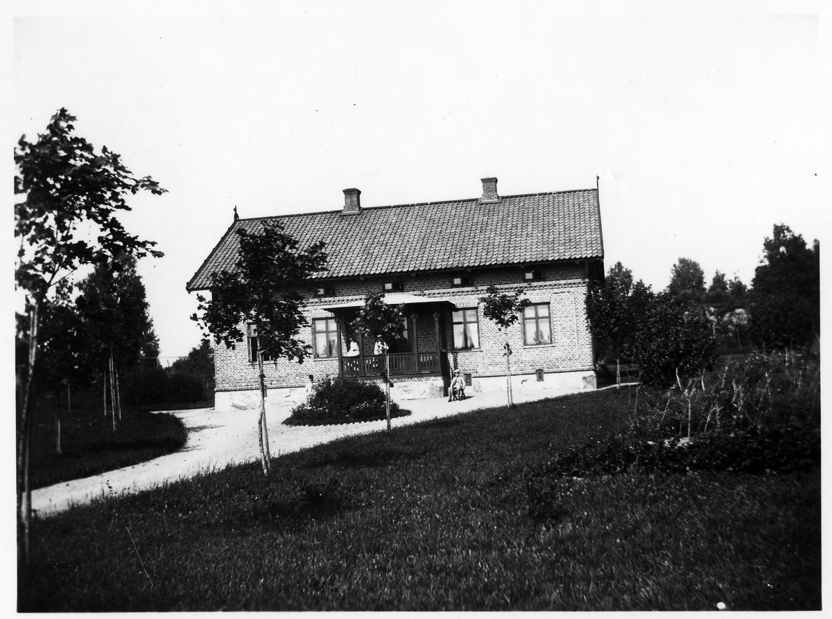 Ett antal människor på och vid verandan till Nolhagas förvaltarboställe.