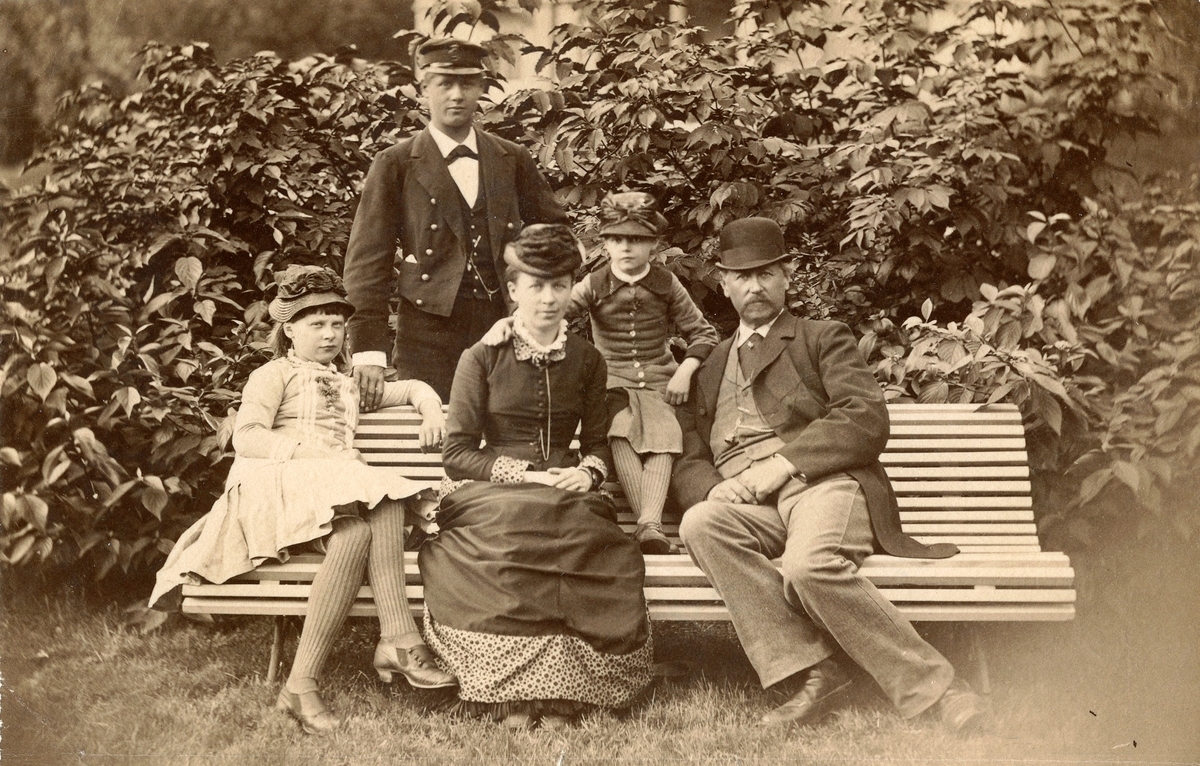 Porträtt av familjen Adelsköld på Nolhaga. På bänken sitter Annie Adelsköld, Gustava Adelsköld (f. Brolin) och Claes Adelsköld. Bakom dem står Axel Adelsköld och bredvid honom sitter Alma Adelsköld, av familjen kallad Maja.