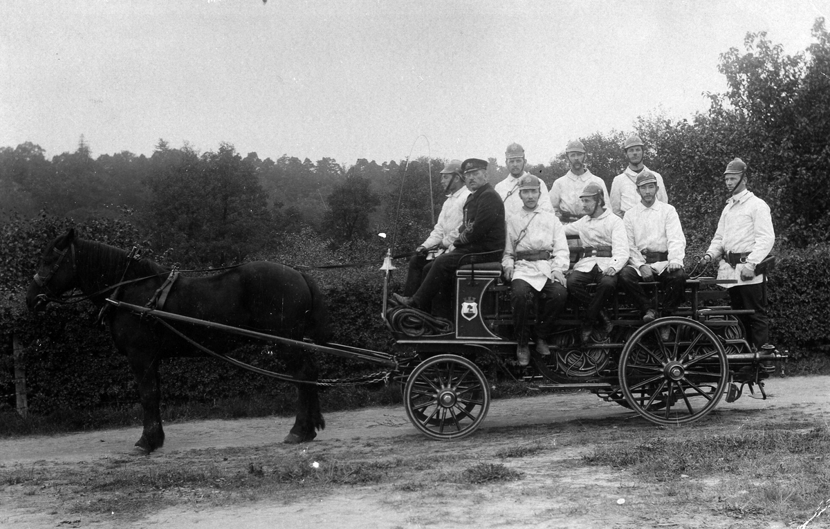 Alingsås brandkår, i vita uniformer, sitter på brandvagn dragen av en häst. På kuskbocken sitter brandchef John Möller och kusk John Blomqvist. Stående från vänster: Fridolf Hallgren (brandmästare), Oscar Söderberg (skomakare), Axel Lorentzon (plåtslagare). Sittande från vänster: John Svedberg (f.d. snickare), Artur Petersson (målarmästare), Carl Johansson (snickare). Stående på fotsteget: Sigfrid Svensson (charkuterihandlare). Redskapsvagnen köptes in 1913.