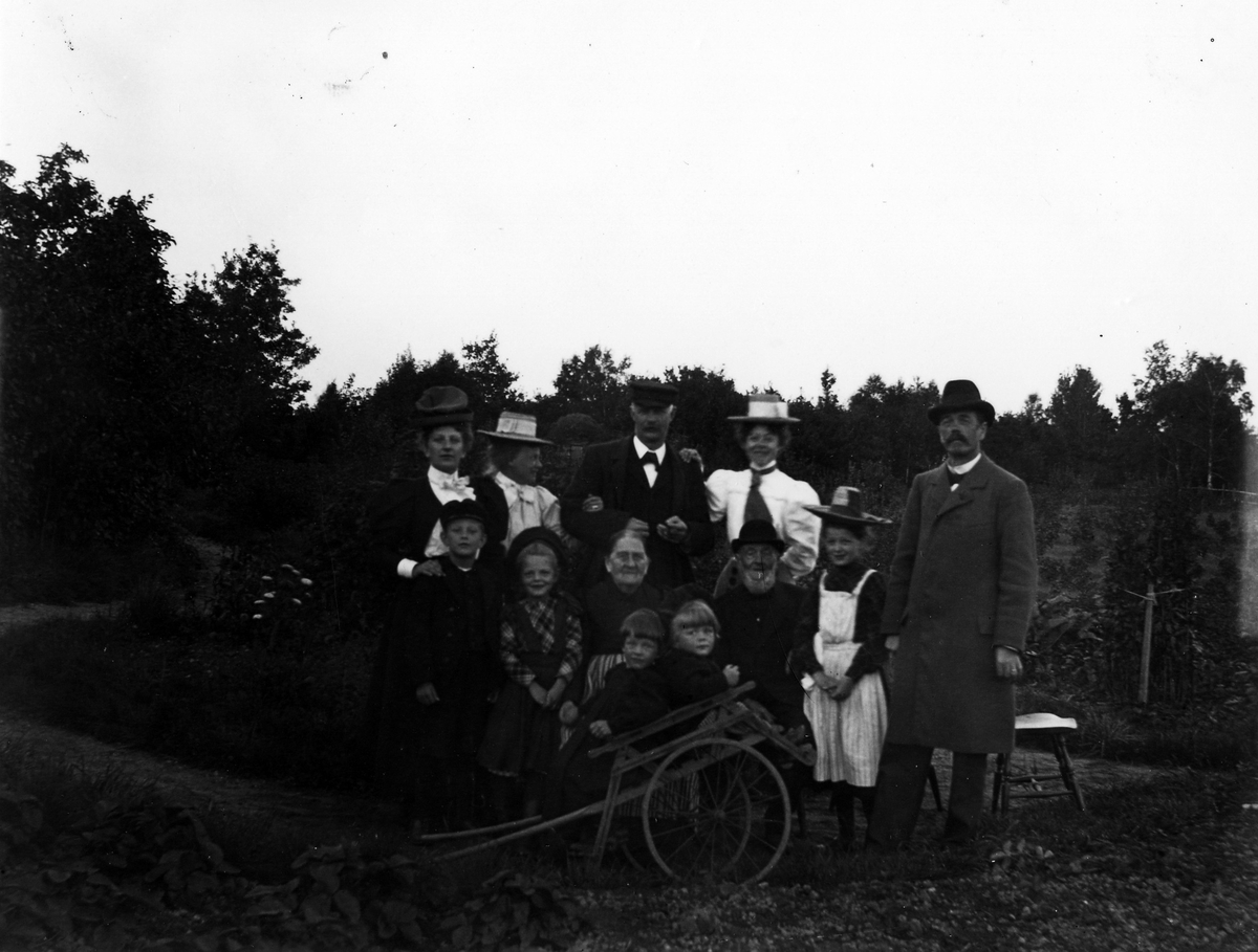 Tre män, fyra kvinnor och fem barn. Till höger: Stadsfiskal Nilsson. Till vänster: Fru Nilsson.