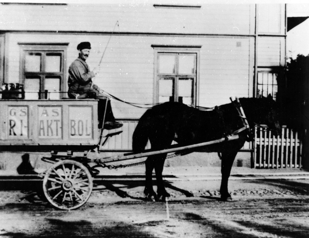 Gotthard Olsson, utkörare av pilsner från Alingsås bryggeri, sitter i bryggeriets vagn bakom en häst.