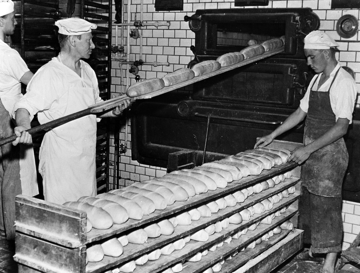 Lennartssons bageri. Bakning av matbröd. Tre bagare arbetar.