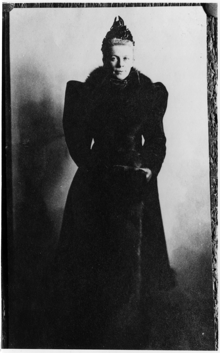 Porträtt av Gustava Adelsköld. Till bilden har hennes dotter Bib Adelsköld skrivit "Kappa från Lundin. Tjock plysch med svarbrunskimrande skunk på krage, manschetter och nerikring. Hatt från Folkers efterträdare? Folkers gjorde bahytter redan åt pappas och mammas farmödrar och mormödrar. Kappan väl från ca 1896-97. Claes Adelsköld tecknade själv alla sin hustrus kläder och smycken ända fram till 1900-talet."