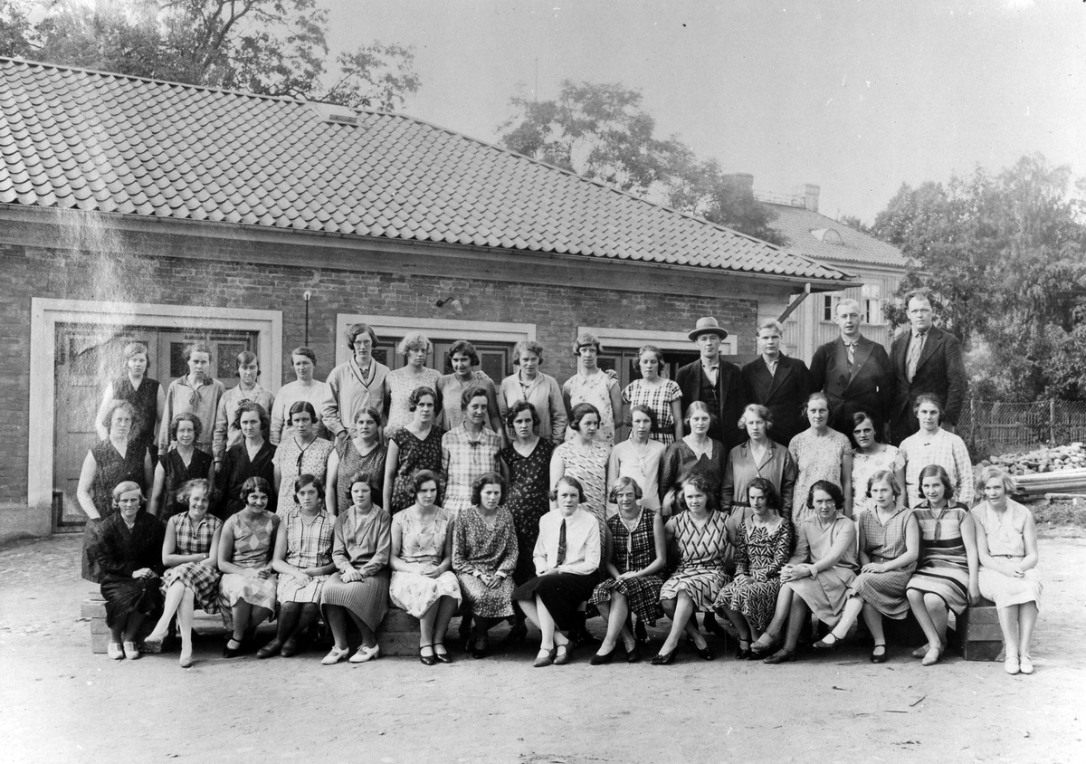 Gruppbild av ett 30-tal anställda, kvinnor och män, utanför Kaboms byxverkstad.