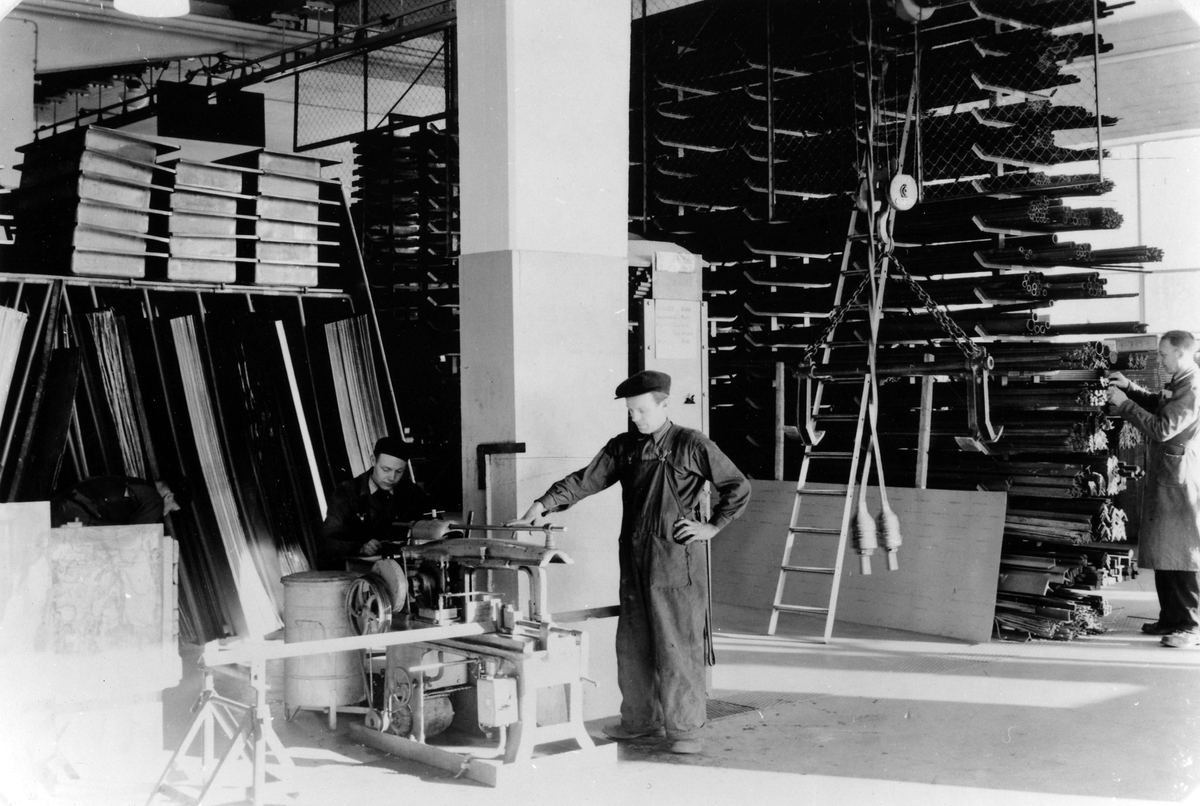 Plåt och stångförrådet på Electro-Helios. Från Vänster Nils Nilsson, Olle Karlsson, Herr Lindvall (Lagerchef).
