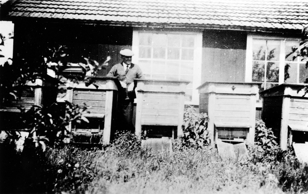 En man står vid ett antal bikupor i Alex Carlssons handelsträdgård i kv. Fregatten. Trädgården startade 1916-17 och drevs fram till 1940-talets början. Alex Carlsson hade tidigare, 1910-16 en speceriaffär på Stampen. Vid sidan om trädgårdsskötseln sålde han även honung och som mest hade han 21 bisamhällen.