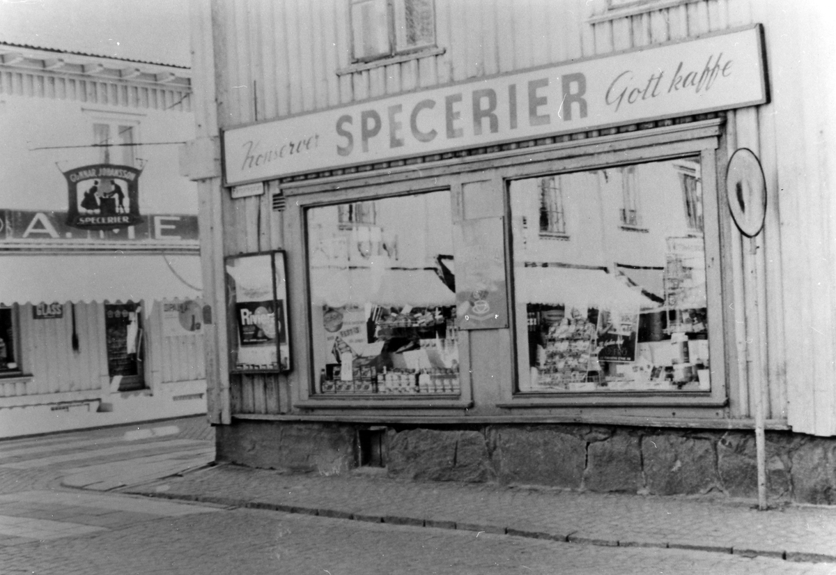 Gatuvy av Gunnar Johanssons Speceriaffär. Skylt som sträcker sig över 2 skyltfönster med texten "Konserver Specerier Gott kaffe". Ingången i hörnan har en skylt över dörren med texten "Gunnar Johansson Specerier".
